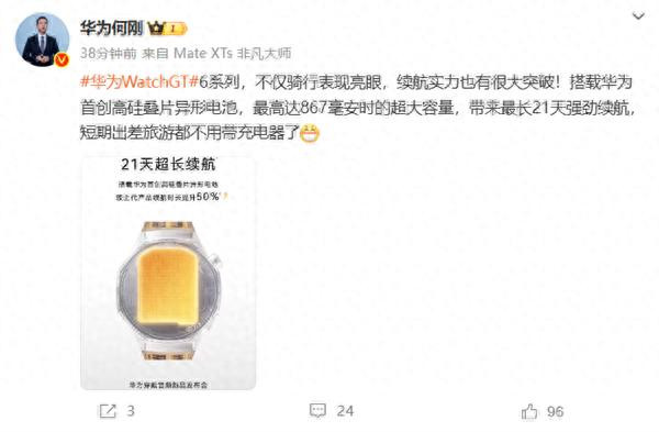 华为WATCH GT 6系列将搭载华为首创高硅叠片异形电池,电池容量提升65%,最高达867mAh,实现21天超长续航,较上代产品续航时长提升50%。