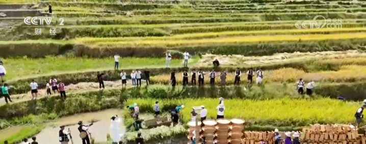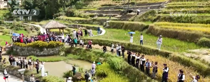 眼下,在云南省红河州红河县,稻谷在田垄间渐次泛黄,游客与村民齐聚稻浪间,共享丰收喜悦。