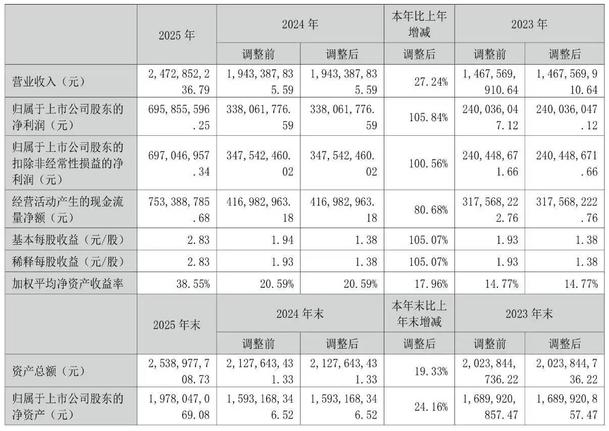 全年兴齐眼药实现营业总收入24.73亿元,同比增长27.24%;归属于母公司所有者的净利润6.96亿元,同比暴增105.84%,利润增速达到营收增速的近4倍;扣非净利润6.97亿元,同比增长100.56%,非经常性损益占比仅为-0.17%,意味着全年利润增长完全由主营业务驱动,没有任何非经营收益的水分,盈利质量处于行业顶尖水平。