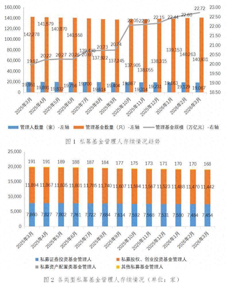截至2026年3月末,存续私募基金管理人19067家,管理基金数量140931只,管理基金规模22.72万亿元。其中,私募证券投资基金管理人7454家;私募股权、创业投资基金管理人11442家;私募资产配置类基金管理人3家;其他私募投资基金管理人168家。