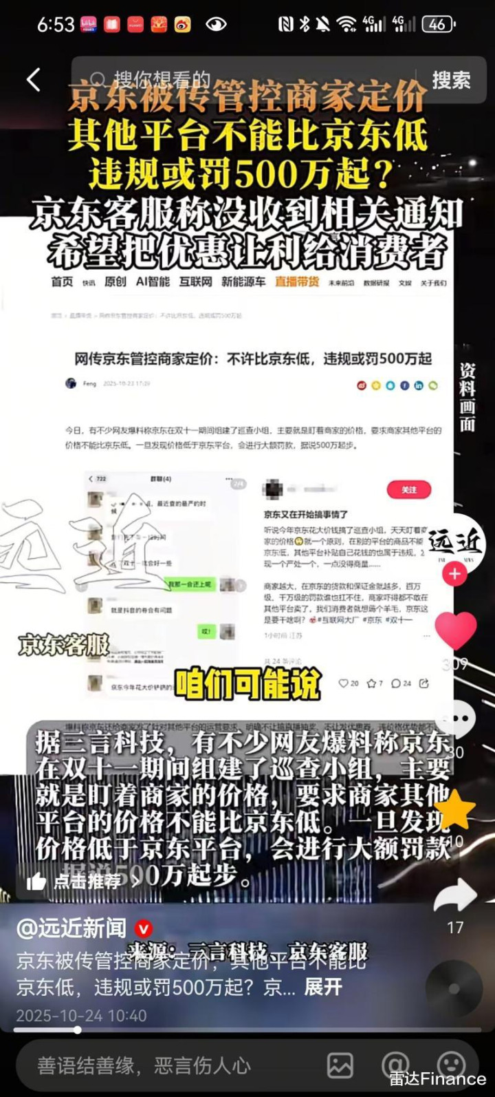 此外,还有视频称京东慌了,正常竞争打不过,所以才搞“二选一”。有的视频甚至称,京东向全网宣战,一条链接被京东罚500万。