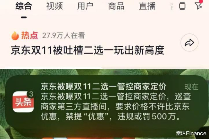 此外,今日头条还推送了“京东被曝双11二选一管控商家定价”的文章。