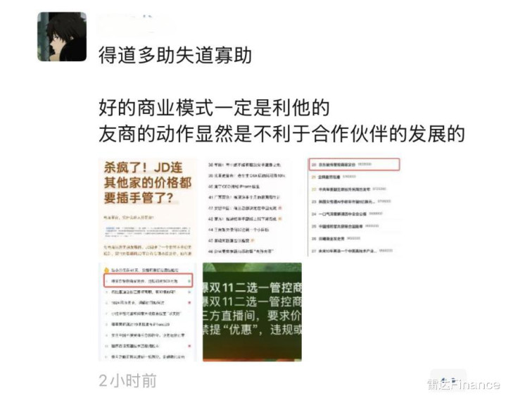 针对该高管声称的“得道者多助”,这位前京东采销反呛:“你收取商家高昂的费用,就是得道者吗?商家因为你高昂的费用,就要加价卖给消费者,你就是得道者了吗?这明显就是扣‘帽子’,栽赃给京东。”